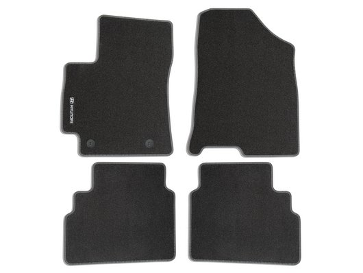 Високоякісні велюрові килимки забезпечують захист підлоги та стиль, завдяки якому інтер’єр виглядає чистим і новим. Вони виготовлені спеціально для ідеального розміщення в просторі для ніг і утримуються на місці стандартними точками кріплення та протиковзкою підкладкою. Килимки переднього ряду мають вишитий логотип Hyundai. Набір із 4 шт.